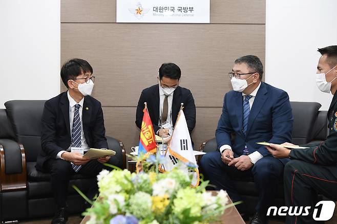 (서울=뉴스1) = 박재민 국방부 차관이 20일 ‘서울 국제 항공우주 및 방위산업전시회 2021’ 참석을 위해 방한한 바야르마그내 바추흐(Bayarmagnai Batsukh) 몽골 국방차관과 양자회담을 개최하고, 양국 간 국방교류협력 및 방산협력 현안에 대해 논의하고 있다. (국방부 제공) 2021.10.20/뉴스1