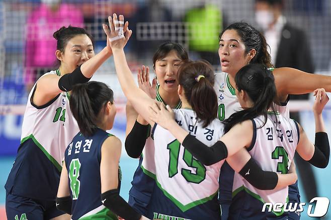 (서울=뉴스1) = 20일 김천 실내 체육관에서 열린 도드람 2021-2022 V리그 현대건설과 도로공사와의 경기에서 현대건설 선수들이 환호하고 있다. (현대건설 배구단 제공) 2021.10.20/뉴스1