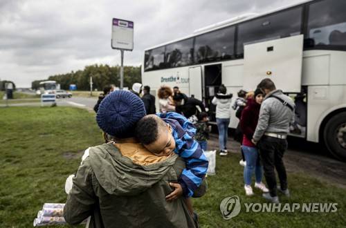 epa09534338 Newly arrived asylum seekers on their way to the application center for asylum seekers in the Groningen village of Ter Apel, The Netherlands, 20 October 2021. Ter Apel's municipal council seeks agreements with the central government about the reception of a maximum of 2,000 people as the asylum seekers' center is overcrowded. EPA/REMKO DE WAAL