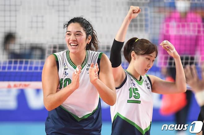 (서울=뉴스1) = 20일 김천 실내 체육관에서 열린 도드람 2021-2022 V리그 현대건설과 도로공사와의 경기에서 현대건설 야스민이 박수를 치며 환호하고 있다. (현대건설 배구단 제공) 2021.10.20/뉴스1