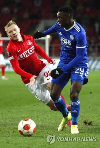 epa09534349 Nikolai Rasskazov (L) of Spartak Moscow in action against Patson Daka (R) of Leicester during the UEFA Europa League group C soccer match between FC Spartak Moscow and Leicester City in Moscow, Russia, 20 October 2021. EPA/YURI KOCHETKOV
