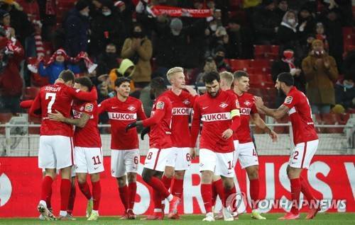 epa09534359 Aleksandr Sobolev (L) of Spartak Moscow celebrates with teammates after scoring the opening goal during the UEFA Europa League group C soccer match between FC Spartak Moscow and Leicester City in Moscow, Russia, 20 October 2021. EPA/YURI KOCHETKOV