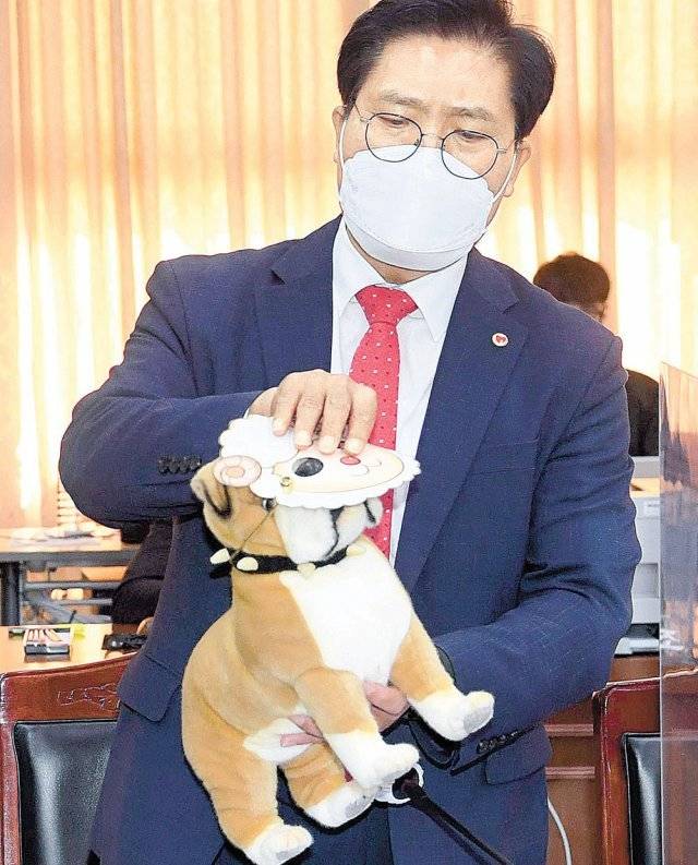 | 野, ‘양의 탈을 쓴 개 인형’으로 이재명 비판 20일 국회 국토교통위원회의 경기도 국정감사에서 국민의힘 송석준 의원이 더불어민주당 이재명 대선 후보를 비판하기 위해 양 탈을 쓴 개 인형을 꺼냈다.수원=사진공동취재단 |