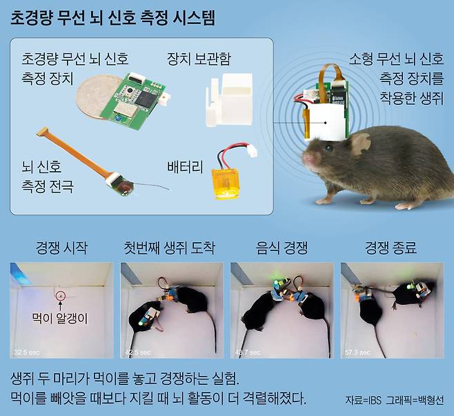 기초과학연구원(IBS) 인지 및 사회성연구단의 신희섭 명예연구위원과 한국과학기술연구원(KIST) 뇌과학연구소 조일주 박사 연구진은 “경쟁 과정에서 나타나는 뇌신호를 감지하는 초소형 무선 측정 장치를 개발했다”고 국제 학술지 ‘바이오센서스 앤드 바이오일렉트로닉스’에 지난 5일 밝혔다.