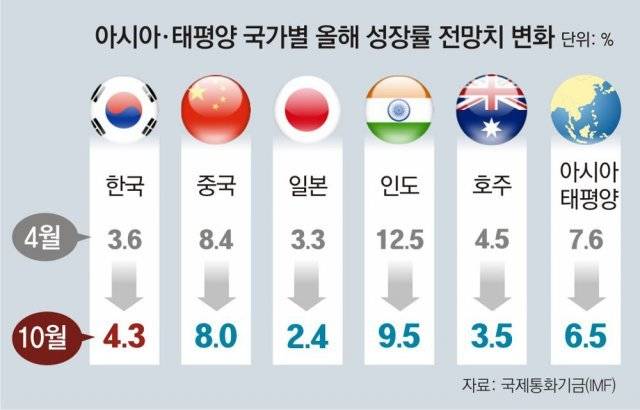 올 성장률 전망치를 국가별로 보면 중국이 4월 전망치보다 0.4%포인트 낮은 8.0%의 성장률이 예상됐고 한국이 4.3%, 일본이 2.4%, 호주가 3.5%, 인도가 9.5% 등으로 각각 전망됐다. 중국은 부동산회사 헝다의 파산 위기와 공급망 위기, 전력난 등의 여파로 최근 발표된 3분기(7∼9월) 성장률이 예상보다 낮은 4.9%에 그치며 시장에 충격을 준 바 있다. 한국은 7월 발표된 전망치를 유지했다. IMF는 7월 한국의 전망치를 4월 대비 0.7%포인트 올린 4.3%로 상향하면서 한국의 적극적 재정정책을 거론했다.