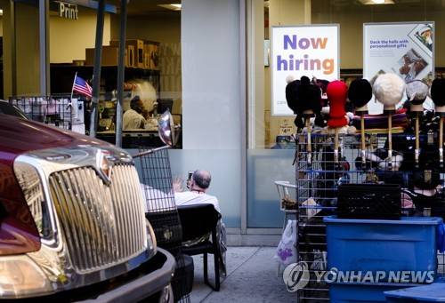 epa09534924 A street vendor (L) sits near a sign advertising job openings in a retail store in New York, New York, USA, 20 October 2021. The U.S. economy is continuing to struggle with the ongoing effects of the coronavirus pandemic as the U.S. Labor Department reporting weaker than expected job growth in September, in part because of difficulties filing open jobs, as well as ongoing concerns about inflation and supply chain disruptions. EPA/JUSTIN LANE