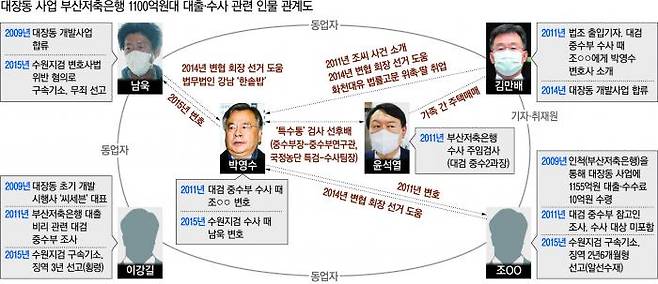 부산저축은행의 대장동 대출 건은 4년 뒤인 2015년 수원지검 특수부가 수사했고, A씨는 알선수재 혐의로 구속기소돼 징역 2년6개월을 확정받았다. 예금보험공사가 대장동 대출금 미회수와 관련해 남 변호사 등을 수사의뢰해 경·검의 수사가 시작되자 이 때도 박 전 특검은 수사 단계에서 남 변호사, A씨의 변호를 맡았다.