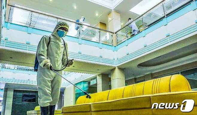 (평양 노동신문=뉴스1) = 북한 노동당 기관지 노동신문은 21일 "비상방역 사업의 완벽성을 백방으로 담보하자"라고 강조했다. 사진은 소독 작업을 진행 중인 류경치과병원.