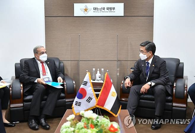 (서울=연합뉴스) 서욱 국방부 장관이 지난 20일 '서울 국제 항공우주 및 방위산업 전시회 2021'(서울 ADEX 2021) 참석을 위해 방한한 모하메드 아흐메드 모르시 이집트 방산물자부장관과 양자회담을 하고 있다. 2021.10.21