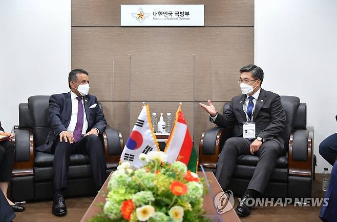 (서울=연합뉴스) 서욱 국방부 장관이 지난 20일 '서울 국제 항공우주 및 방위산업 전시회 2021' 참석차 방한한 모하메드 빈 나세르 빈 알리 알 자비 오만 국방사무총장과 양자회담을 하고 있다. 2021.10.21