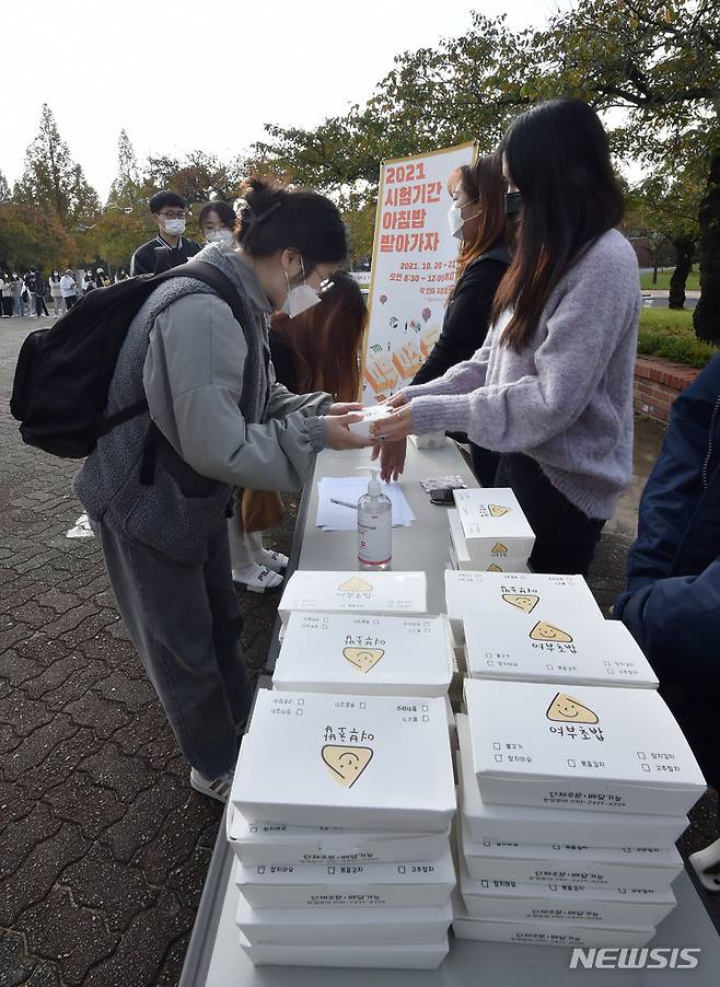 [경산=뉴시스] 이무열 기자 = 21일 오전 경북 경산시 대구대학교 사범대학 앞에서 학생들이 학생처가 준비한 아침밥을 나눠 받고 있다. 이번 행사는 아침식사 결식률이 높은 대학생들의 아침밥 먹는 문화를 확산하고 2학기 중간고사를 응원하기 위해 마련됐다. 2021.10.21. lmy@newsis.com
