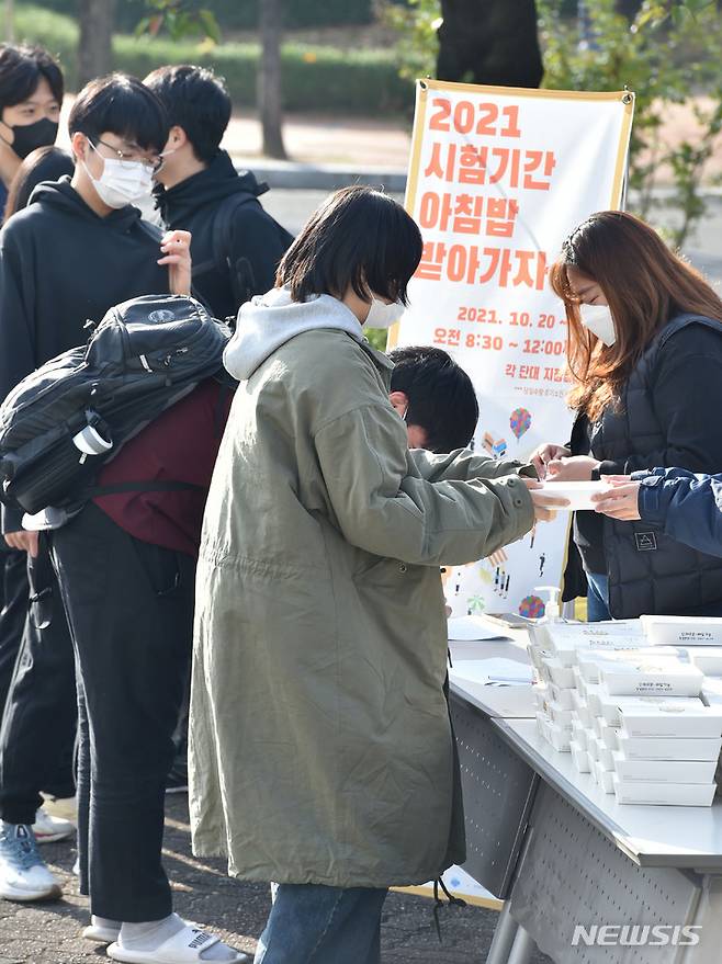 [경산=뉴시스] 이무열 기자 = 21일 오전 경북 경산시 대구대학교 사범대학 앞에서 학생들이 학생처가 준비한 아침밥을 나눠 받고 있다. 이번 행사는 아침식사 결식률이 높은 대학생들의 아침밥 먹는 문화를 확산하고 2학기 중간고사를 응원하기 위해 마련됐다. 2021.10.21. lmy@newsis.com