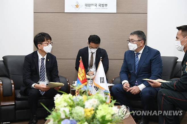 (서울=연합뉴스) 박재민 국방부 차관(왼쪽)이 지난 20일 '서울 ADEX 2021' 행사 참석차 방한한 바야르마그내 바추흐 몽골 국방차관(왼쪽 세 번째)과 경기도 성남 서울공항 내 회의실에서 양자 회담을 하고 있다. 2021.10.21