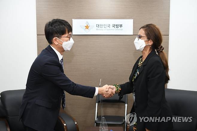 (서울=연합뉴스) 박재민 국방부 차관(왼쪽)이 지난 20일 '서울 ADEX 2021' 행사 참석차 방한한 콜롬비아 국방부 산드라 알사떼 국제협력차관과 경기도 성남 서울공항 내 회의실에서 회담에 앞서 악수하고 있다. 2021.10.21