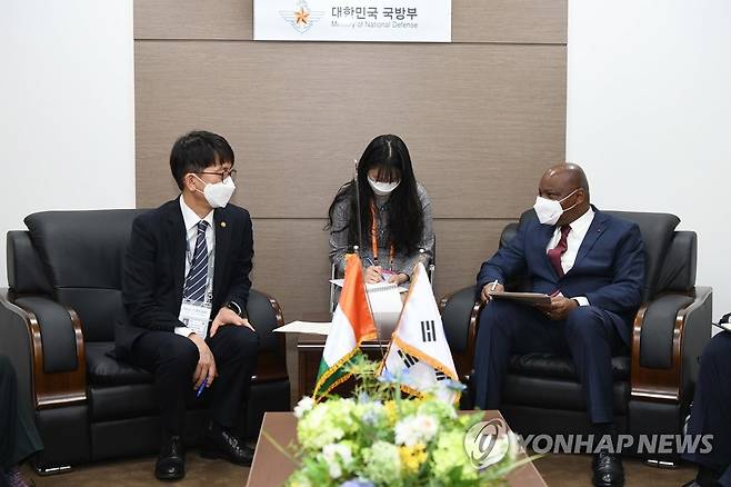 (서울=연합뉴스) 박재민 국방부 차관(왼쪽)이 지난 20일 '서울 ADEX 2021' 행사 참석차 방한한 장 폴 말랑 코트디부아르 국방차관과 서울공항 회의실에서 양자 회담을 하고 있다. 2021.10.21