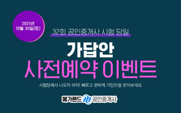 메가랜드가 10월 30일 진행되는 제 32회 공인중개사 시험시간을 안내하고, 시험 전 가답안 사전예약 이벤트를 진행한다.