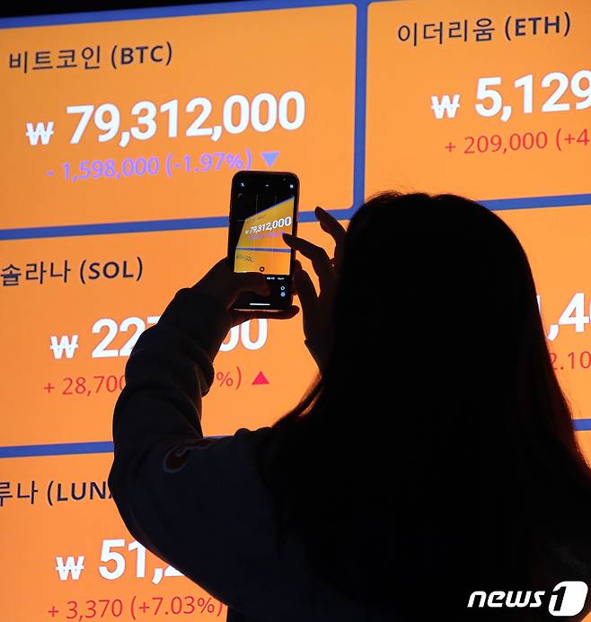 (서울=뉴스1) 김진환 기자 = 비트코인이 상장지수펀드(ETF) 출시 효과로 역대 최고가에 거래 중인 21일 오전 서울 서초구 빗썸 고객지원센터 전광판에 암호화폐 가격이 표시되고 있다. 2021.10.21/뉴스1
