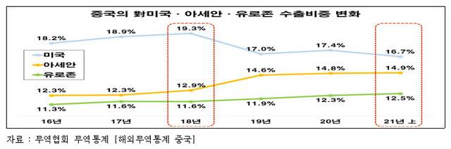 중국은 최대 수출 상대국인 미국과 무역전쟁을 벌이며 2020년 대미 수출이 2018년에 견줘 5.3%, 대미 수입은 11.9% 줄었다. 그 와중에도 2020년 전체 수출은 2018년보다 5.0% 증가했다. 수출선을 아세안과 유럽연합(EU)으로 돌린 데 따른 성과였다고 전경련은 분석했다.