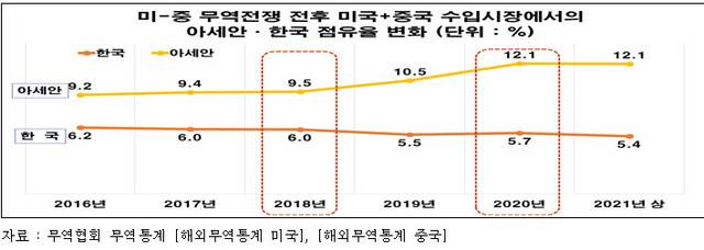 이에 따라 미-중 무역전쟁이 터진 2018년에 견줘 2020년 미국과 중국의 수입시장에서 아세안의 점유율은 9.5%에서 12.1%로 높아졌고, 한국의 점유율은 6.0%에서 5.4%로 낮아졌다.