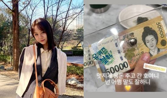 최근 tvN 예능 '유퀴즈'에 출연한 배우 정호연이 문제를 맞히고 탄 상금 봉투에 용돈을 넣어 혜리에게 전해준 것으로 보인다.