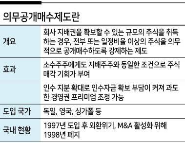 이에 소액주주 보호 제도인 의무공개매수제도를 재도입해야 한다는 목소리가 높다. 의무공개매수제도는 기업 인수자가 지배주주가 보유한 주식을 프리미엄을 주고 매입하면 소액주주의 주식도 동일한 가격으로 인수 제의를 하도록 하는 제도다. 우리나라에서 1997년 도입됐지만 외환위기 직후 M&A를 통한 기업 구조조정이 시급해지면서 폐지된 바 있다.