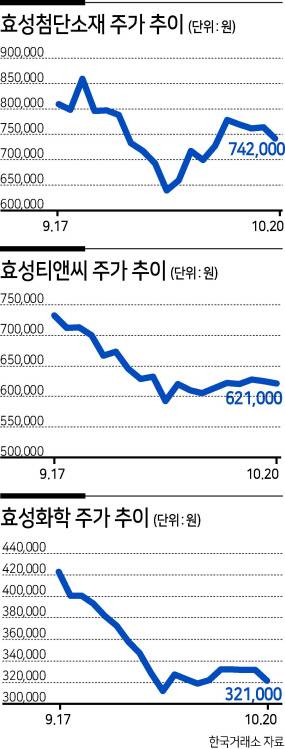 반면, 효성티앤씨와 효성화학는 부진을 면치 못하고 있다. 효성티앤씨 주가는 지난달 70만원 중반에 머물렀지만 최근 60만원초반까지 내려 앉았다. 지난 6일엔 60만원선이 무너지기까지 했다. 효성화학도 지난달 42만원선에서 최근 32만원선까지 큰폭으로 하락했다.