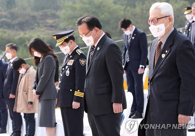(아산=연합뉴스) 김주형 기자 = 김부겸 국무총리가 21일 오전 충남 아산시 경찰수사연구원에서 열린 경찰의 날 기념식에 참석해 묵념하고 있다. 2021.10.21
