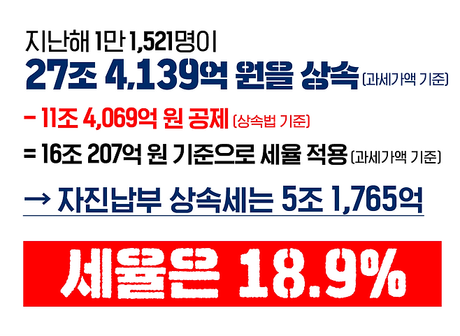 다만, 가치 논쟁은 여전히 남았습니다. 위 통계를 근거로, 누구는 "공제를 더 줄여 상속세율을 높여야 한다"고 주장할 수 있고, 또 누구는 "대기업의 상속세가 과도하니 줄여야 한다"고 말할 수도 있습니다. 누구는 "최고 상속세율 50%란 말은 수백 억 원 자산가의 사례일 뿐인데, 마치 모두에게 적용되는 것 같이 쓰이면 안 된다"고 말할 수 있고, 또 누구는 "어쨌든 재산의 절반 가까이 세금을 내야 하는 구성원이 존재하며, 이는 시장 경제의 효율성을 떨어뜨릴 수 있다"고 반박할 수 있습니다.