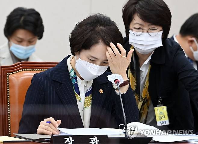 (서울=연합뉴스) 전수영 기자 = 유은혜 사회부총리 겸 교육부 장관이 21일 서울 여의도 국회에서 열린 교육위원회의 교육부와 소속·공공·유관기관 등에 대한 종합감사에서 국감자료를 검토하고 있다. 2021.10.21 [국회사진기자단]