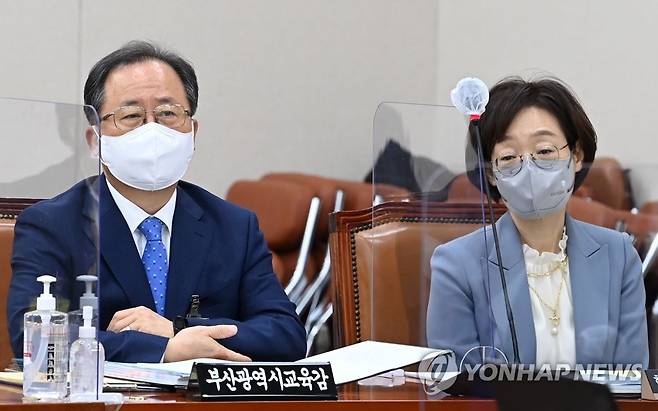 (서울=연합뉴스) 전수영 기자 = 김석준 부산광역시 교육감(왼쪽)과 박혜자 한국교육학술정보원장이 21일 서울 여의도 국회에서 열린 교육위원회의 교육부와 소속·공공·유관기관 등에 대한 종합감사에서 의원들의 질문을 듣고 있다. 2021.10.21 [국회사진기자단]