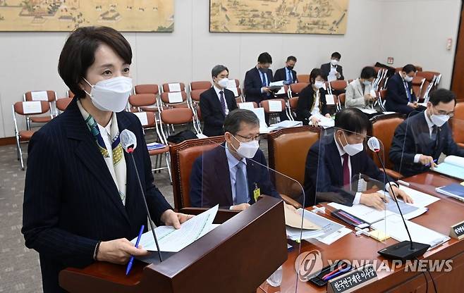 (서울=연합뉴스) 전수영 기자 = 유은혜 사회부총리 겸 교육부 장관이 21일 서울 여의도 국회에서 열린 교육위원회의 교육부와 소속·공공·유관기관 등에 대한 종합감사에서 업무보고를 하고 있다. 2021.10.21 [국회사진기자단]