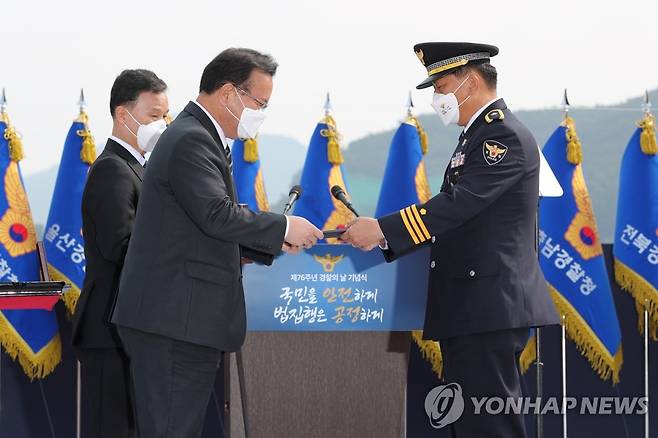 (아산=연합뉴스) 김주형 기자 = 김부겸 국무총리가 21일 오전 충남 아산시 경찰수사연구원에서 열린 경찰의 날 기념식에서 조성문 경기남부청 과학수사과 경위에게 옥조근정훈장을 수여하고 있다.