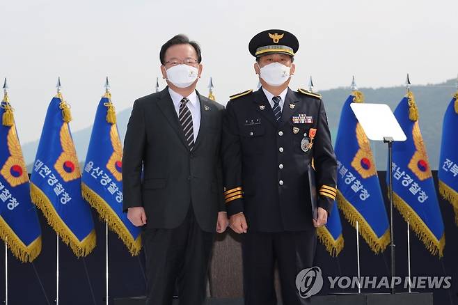 (아산=연합뉴스) 김주형 기자 = 김부겸 국무총리가 21일 오전 충남 아산시 경찰수사연구원에서 열린 경찰의 날 기념식에서 조성문 경기남부청 과학수사과 경위에게 옥조근정훈장을 수여한 뒤 기념 촬영하고 있다.