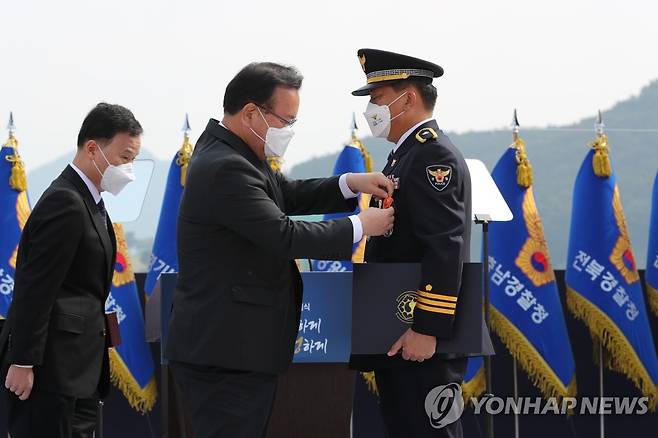 (아산=연합뉴스) 김주형 기자 = 김부겸 국무총리가 21일 오전 충남 아산시 경찰수사연구원에서 열린 경찰의 날 기념식에서 조성문 경기남부청 과학수사과 경위에게 옥조근정훈장을 수여하고 있다.