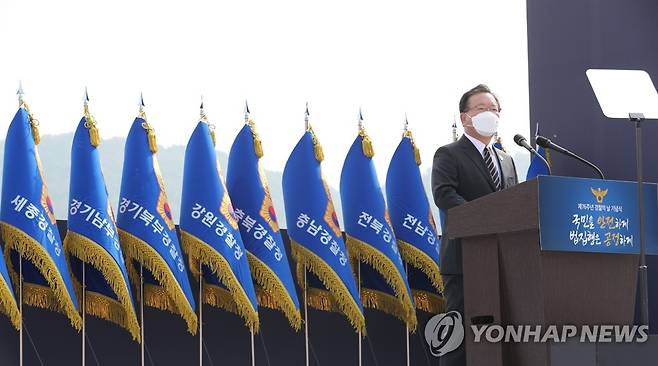 (아산=연합뉴스) 김주형 기자 = 김부겸 국무총리가 21일 오전 충남 아산시 경찰수사연구원에서 열린 경찰의 날 기념식에 참석해 축사하고 있다. 2021.10.21
