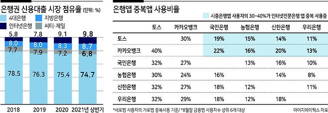하나금융경영연구소는 21일 ‘2022년 금융산업 전망’ 보고서에서 인터넷전문은행의 대약진을 예상했다. 올 상반기 신용대출 시장에서 일반은행 14개 중 카카오뱅크과 케이뱅크 인터넷전문은행 두 곳의 점유율은 9.8%다. 지난해 지방은행을 추월한 이후 격차를 더 벌리고 있다. 가계대출 전체로 보면 주택담보대출 비중이 낮음에도 불구하고 4.1%로 지방은행(8.8%)의 절반수준에 육박했다.