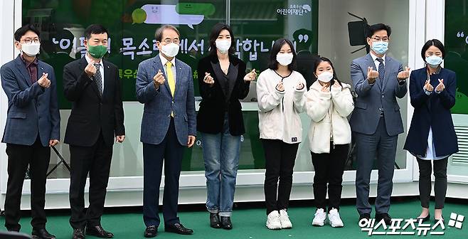 (엑스포츠뉴스 박지영 기자) 21일 오전 서울 삼성동 코엑스 아셈광장에서 진행된 초록우산 어린이재단 '#아이들의 목소리' 캠페인 행사에 참석한 한국무역협회 김고현 상무, 강남구청 홍종남 관광진흥과장, 초록우산어린이재단 이제훈 회장, 배우 채정안, 키즈 크리에이터 간니닌니 자매 등이 기념 촬영을 하고 있다.