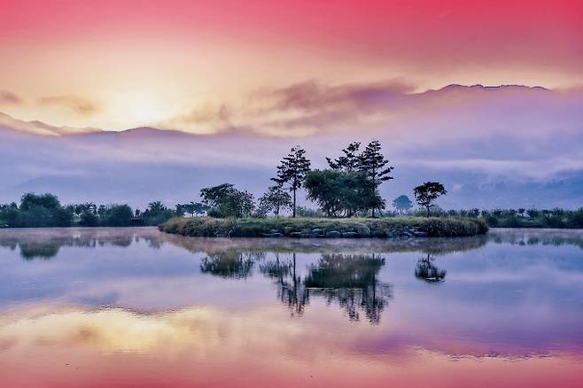이른 새벽 산안개와 물안개가 몸을 섞는 운치 있는 풍광은 합천호 둘레길의 백미다.