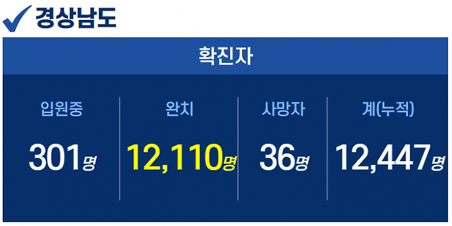 21일 오후 1시30분 기준, 경남도내 입원 중인 확진자는 301명이고, 퇴원 1만2110명, 사망 36명, 누적 확진자는 총 1만2447명이다.