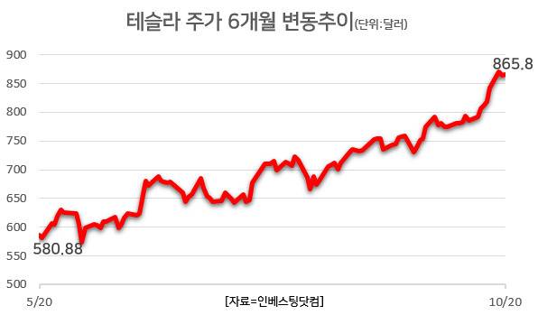 20일 인베스팅닷컴에 따르면 테슬라 주가는 이날(현지 시간) 전 거래일 대비 1.53달러(0.18%) 상승한 865.80달러에 장을 마쳤다. 지난주 초부터 이날까지 10% 넘게 상승한 뒤 800달러 선에 안착했다는 평가다. 테슬라 주가는 최근 3개월간 27.2% 급등했다.