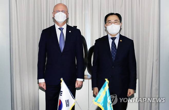 (서울=연합뉴스) 문승욱 산업통상자원부 장관(오른쪽)이 21일 서울 소공동 롯데호텔에서 스클랴르 로만 바실리예비치 카자흐스탄 경제부총리와 면담에 앞서 기념 촬영을 하고 있다. 2021.10.21