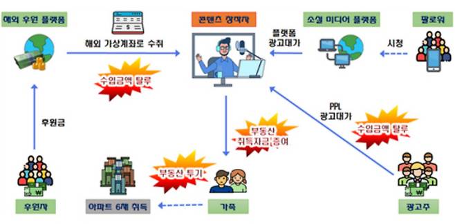 사회관계망서비스(SNS) 상에서 수백만명의 구독자를 보유한 미디어 콘텐츠 창작자 B씨는 해외 후원 플랫폼에서 미공개 영상, 음성 편지, 맞춤형 영상 등 서비스를 제공하는 채널을 운영하면서 가상계좌를 통해 받은 각종 후원금을 소득신고하지 않았다. B씨는 또 간접광고(PPL) 영상을 다수 게시하고 얻은 광고소득을 탈루하고, 이 돈으로 아파트 6가구의 분양권을 가족에게 증여하거나 대출금을 대신 납부하는 방식으로 증여세를 탈루한 혐의를 받고 있다.