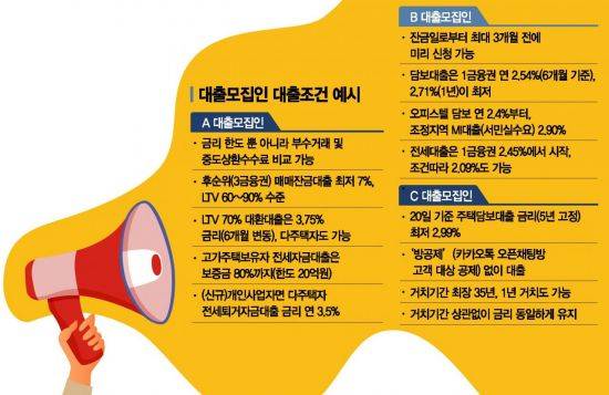 대출한도 20억원까지 DTI(총부채상환비율)와 무관하게 받게 해주겠다"며 "최저금리는 연 3.5%(6개월 변동기준)로 보증금의 80%까지 가능하다"고 제시했다. B대출모집인은 "주택담보대출 시 5년 고정금리 상품이 최저 2.99%인 곳을 소개해주겠다"며 "거치기간은 최장 35년까지 가능한데 1년 거치여도 금리는 똑같다"고 홍보했다.