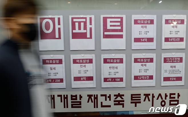 (서울=뉴스1) 안은나 기자 = 서울 아파트값이 7주째 하락세를 보이고 있는 21일 서울시내 공인중개사무소에 부동산 매물이 붙어있다. 2021.10.21/뉴스1