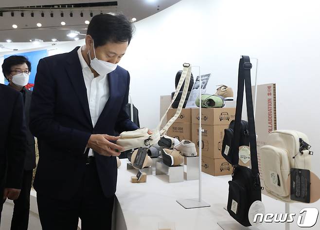 (서울=뉴스1) 송원영 기자 = 오세훈 서울시장이 21일 서울 중구 동대문디자인플라자(DDP)에서 열린 '2021 DDP 디자인페어'에서 디자인 전시품을 관람하고 있다. DDP디자인페어는 제조 분야 소상공인과 디자이너가 협업해 새로운 디자인 제품을 선보이고, 디자인 기업의 신제품도 한자리에 전시하는 행사다. 2019년 시작해 올해로 3회째를 맞는다. 올해는 '일상을 아름답게 만들면 삶은 행복해집니다(Wonderful Life)'를 주제로 소상공인과 디자이너가 짝을 이룬 106개 팀이 5개월간 개발한 신제품 106종을 전시한다. 2021.10.21/뉴스1