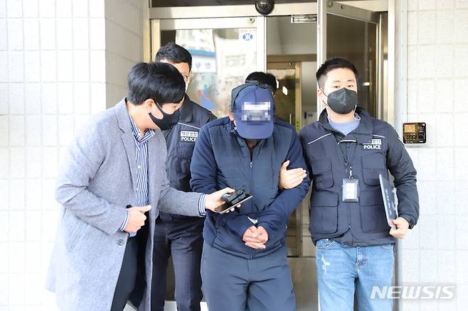 [여수=뉴시스] 김석훈 기자 = 전남 여수 웅천 요트선착장 현장 실습 고교생 사망 사건과 관련해 요트업체 대표 황모(48)씨가 21일 광주지법 순천지원에서 열린 구속전피의자심문(영장실질심사)를 마치고 경찰관과 함께 법원을 나오고 있다. 2021.10.21. kim@newsis.com