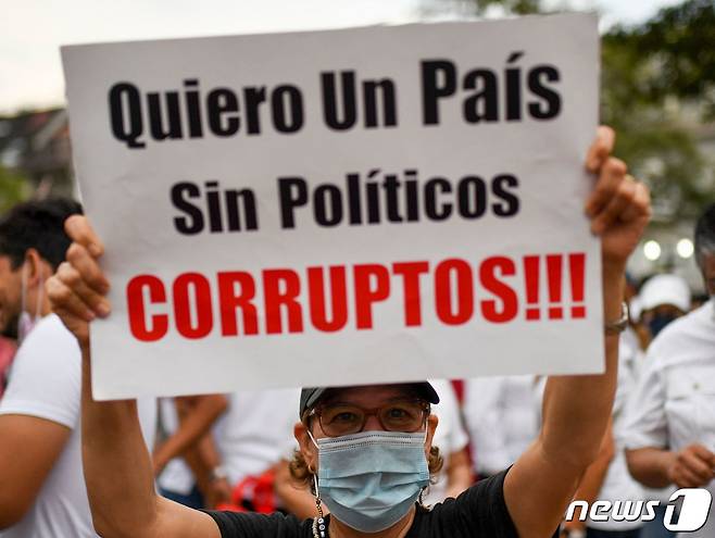 (파나마시티 AFP=뉴스1) 노선웅 기자 = 20일(현지시간) 파나마시티 라스 가르자스 대통령궁 앞에서 한 시위자가 "부패 정치인이 없는 나라를 원한다"라고 적힌 피켓을 들고 선거법 개정을 요구하고 있다.