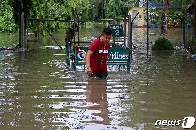 (비라트나가르 AFP=뉴스1) 신윤하 기자 = 20일(현지시간) 네팔 비라트나가르에 폭우가 쏟아진 이후 항공사 직원이 침수된 공항에서 카트를 끌고 있다.