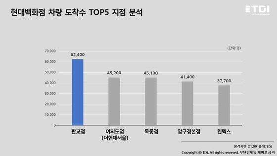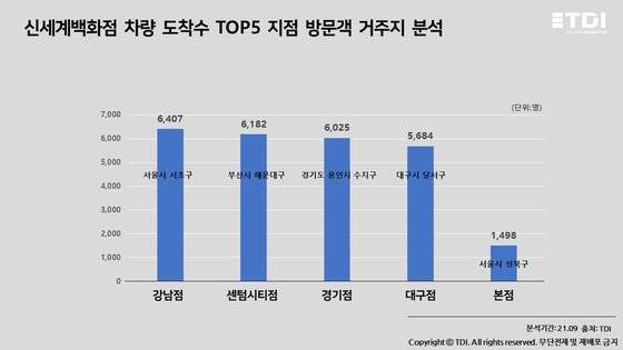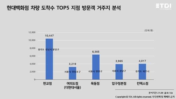 판교점에서는 경기도 성남시 분당구 거주자가 10,447명, 여의도점(더현대서울)은 서울시 영등포구 거주자 3,219명, 목동점에서는 서울시 양천구 거주자 6,365명, 압구정본점에서는 서울시 강남구 3,965명, 킨텍스점에서는 경기도 파주시 거주자가 4,017명으로 집계됐다.