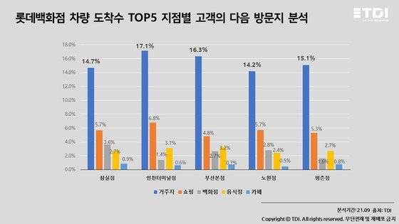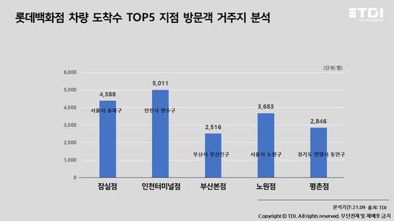 잠실점에서는 서울시 송파구 거주자가 4,388명, 인천터미널점에서는 인천시 연수구 거주자 5,011명, 부산본점에서는 부산시 부산진구 거주자 2,516명, 노원점에서는 서울시 노원구 거주자가 3,863명이었다. 롯데백화점 평촌점을 찾은 방문객 중 경기도 안양시 동안구 거주자는 2,846명으로 집계됐다.
